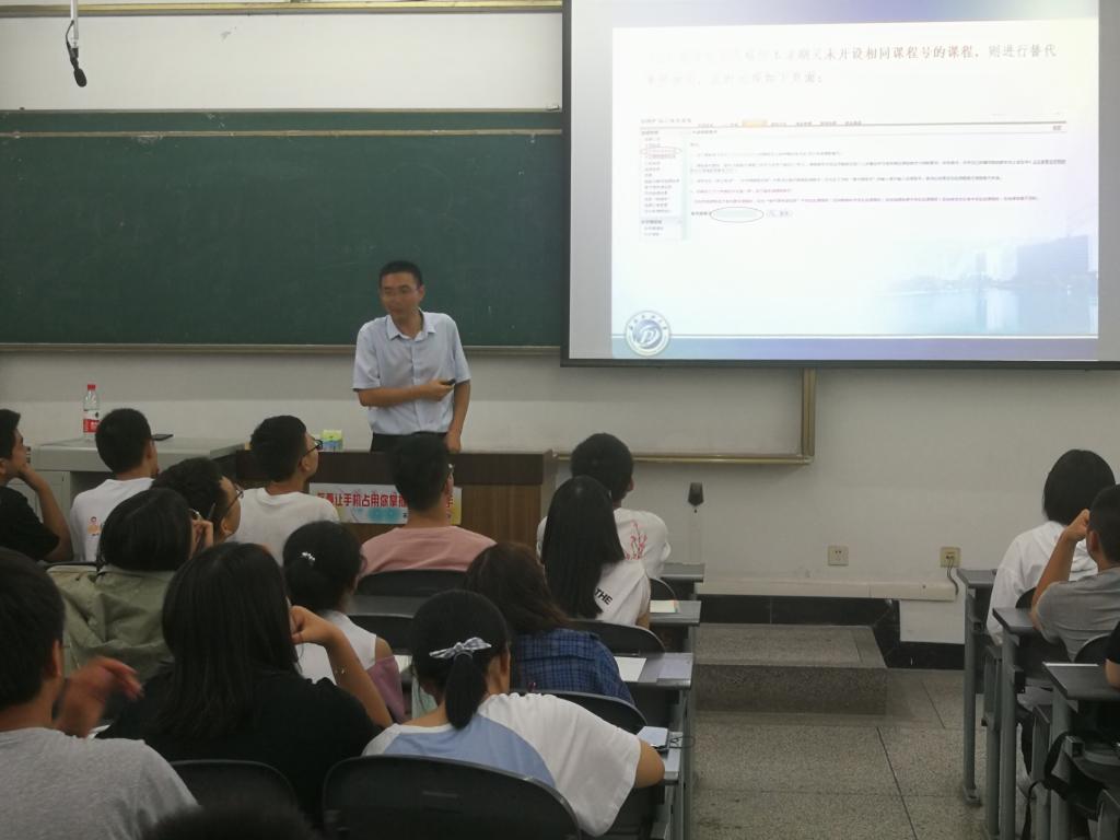 為了讓新生盡快熟悉學(xué)校選課機制,在后期的選課過程中更加順利,9月10日下午3:00-6:00,化工院于思學(xué)樓A311,分專業(yè)進行了2019級新生選課指導(dǎo)。指導(dǎo)會由董軍老師擔(dān)任主講人。 指導(dǎo)會上,董軍首先向同學(xué)們介紹了我校選課機制的大概內(nèi)容,以及直選式、志愿式、學(xué)分券等名詞的含義,讓同學(xué)們有了大概的了解。隨后,他從選課要求、選課方式、如何判斷志愿式與直選式課程、選課流程、支付流程等方面為同學(xué)們進行了詳細(xì)介紹。期間,他強調(diào):“同學(xué)們一定要保護好自己的賬號和密碼,避免被他人盜取,造成不必要的麻煩和損失。”最后,他為同學(xué)們說明了課程信息和培養(yǎng)方案完成情況的查詢方式,并為同學(xué)們解答了疑惑。 指導(dǎo)會結(jié)束后,19級環(huán)境工程的胡小龍表示:“經(jīng)過這次選課指導(dǎo),我了解了選課的流程,也了解了學(xué)校教務(wù)處網(wǎng)站的相關(guān)信息查詢,非常感謝老師的指導(dǎo)?!保ㄎ?span lang="EN-US">/秦佳雯 圖/王文韜、張程暉)