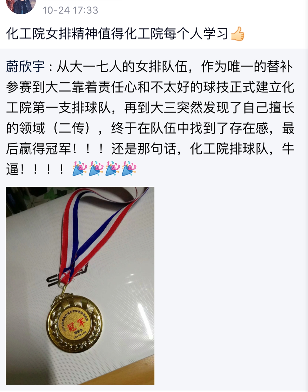上榜語錄: “女排精神不是贏得冠軍,而是努力去贏”郎平這段話,或許可以作為化工女子排球隊最好的標簽?!爸灰?span lang="EN-US">1%的希望,就會拼盡100%的努力,只要你打不死我,我就和你拼到底!”比賽如是,奮斗如是,全院上下一心,奔赴追夢的道路上,亦如是。