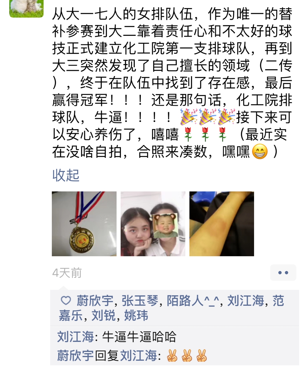 隊長樊雨欣說道:“第一次帶領排球隊進入體育館既興奮又緊張,壓力很大,這一刻的勝利是她們沒有想到的結果。”比分的落后并沒壓倒她們?yōu)樵籂幑獾臎Q心,從開始追趕比分的那一刻,這些姑娘果敢又堅韌,每一個球都不放過,都拼盡全力爭取,撲地,撞胳膊,歪手,每一個動作用盡全力。團結,互相加油,傳遞信心,這就是女排精神,這就是化工精神! 化工女排今年首次奪得冠軍!女排隊員蔚欣宇坦言道:“參賽前自己手部還因為小組賽時受過傷,決賽面對強大的體院,倍感壓力山大!‘從大一有幸被接觸女排,到大二組建我們自己的排球隊!我就堅定了一個目標,哪怕歷經困難,也要和女排一起,在石大成長,打出屬于我們的一片天?!蔽敌烙罨貞浧鹑昵暗臅r光,仿佛一切就在昨天。她感言:“把壓力消化掉,就能轉化為成長的養(yǎng)料?!?/span>