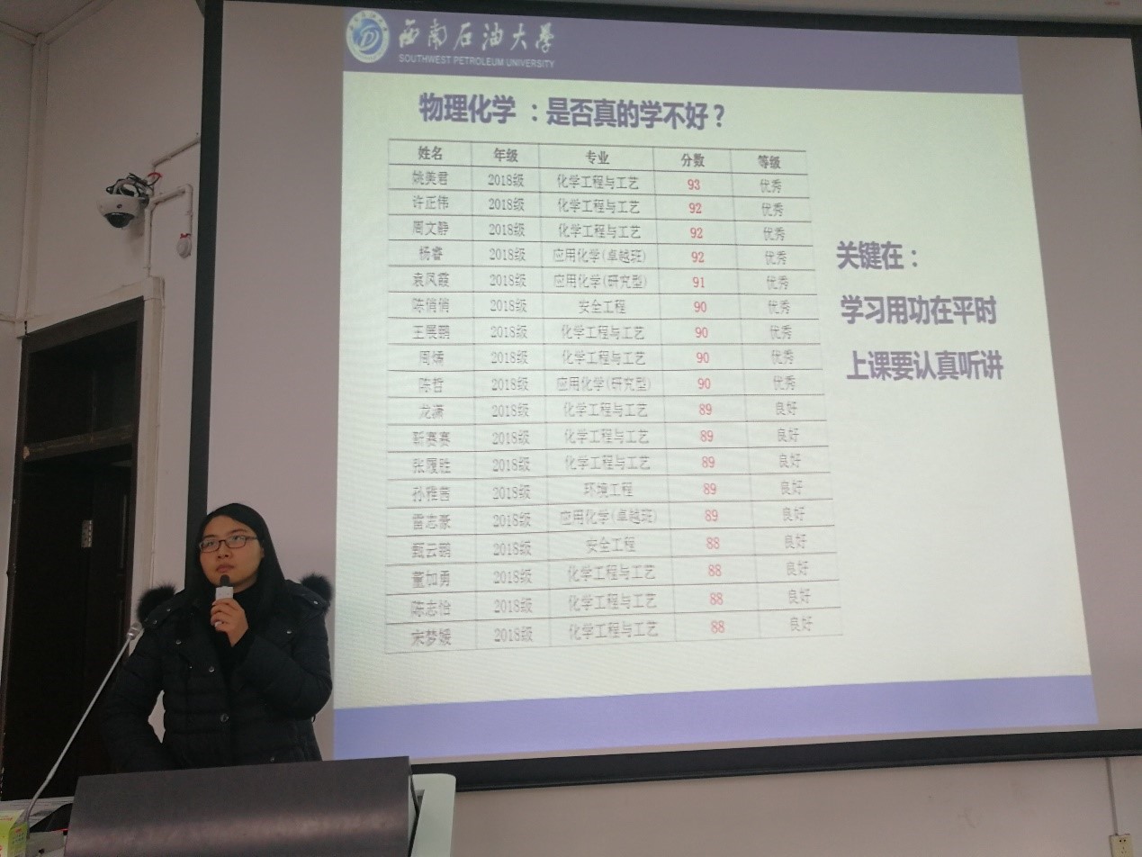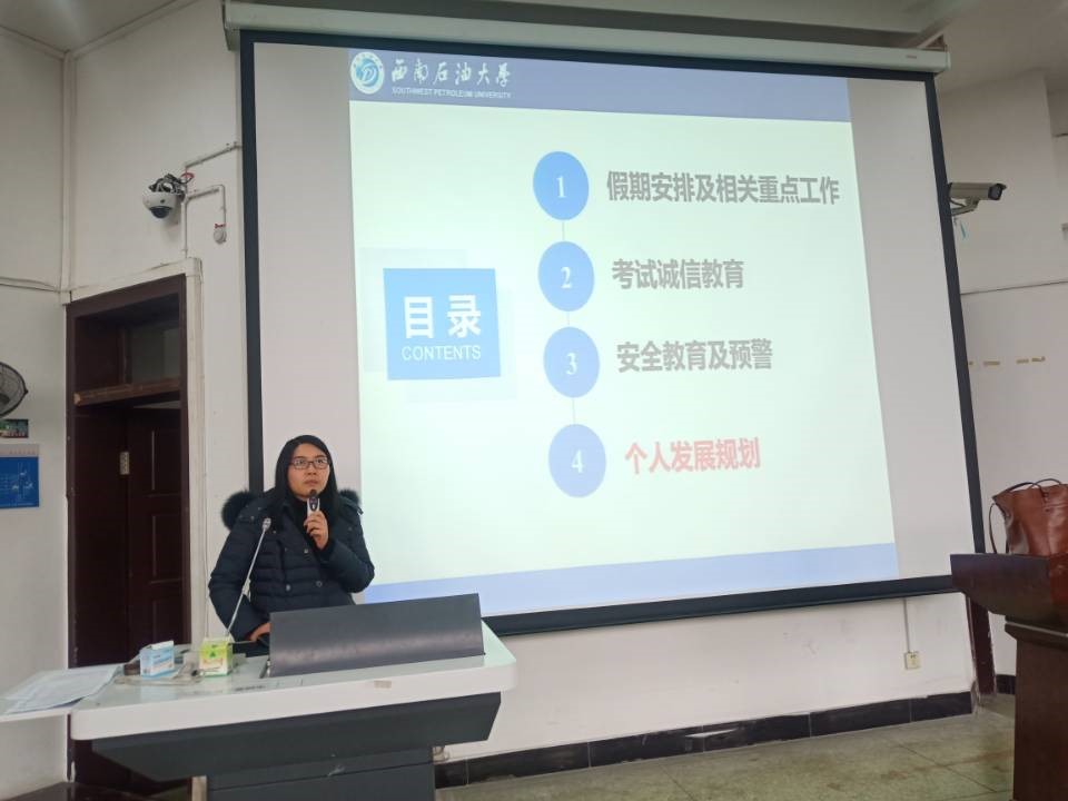 為貫徹落實寒假期間對于學生安全教育及管理工作,端正我院2018級學生的考試態度,12月31日,化工院在思學樓c210召開以2019-2010年秋季學期年級大會,化學工程與工藝、化學、安全工程2018級學生參加此次大會,大會由輔導員鄭璇主持開展。 大會主要從假期及相關重點工作安排、考試誠信教育、寢室安全教育及預警、個人發展規劃等方面展開。 會上,鄭璇對假期安全教育工作進行強調,她表示,希望本次安全教育不僅能讓為同學們在人身、財產安全方面敲響警鐘,而且能夠促進同學們保持健康的心理,同時她還要求班委積極開展學生離校、留校的登記工作,嚴格落實請假和按時返校制度。為提高同學們學習的積極性,鄭璇帶領大家學習各專業的核心課程種類,以及相應的培養學分制度。她逐次分析各專業核心課程《物理化學Ⅱ-Ⅰ》考試成績情況,端正同學們對專業核心課程的學習態度。鄭璇還對同學們進行了誠信考試教育,強化同學們誠信應考的觀念,提醒同學們調整心態、認真復習、驅除僥幸心理、誠信應考。 最后,鄭璇亦希望全體學生能夠以此次大會為契機,進一步加強對自身的管理,在學習生活中找準定位、發揮自身優勢,做好人生規劃,利用好即將到來的寒假時間充實自我。(文/宋夢嬡 圖/王文韜)