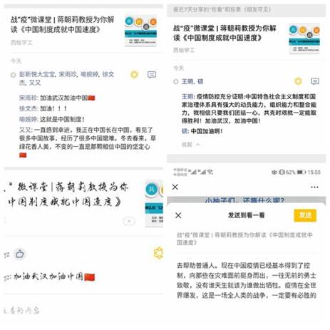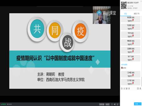 3月19日下午,化工院開展第4期戰(zhàn)“疫”微課堂“共抗疫情、愛國(guó)力行”主題宣傳教育活動(dòng):疫情防控專題形勢(shì)與政策講座,由西南石油大學(xué)馬克思主義學(xué)院蔣朝莉教授解讀《中國(guó)制度成就中國(guó)速度》。學(xué)院組織全體學(xué)生通過(guò)“西柚學(xué)工”微信公眾號(hào),進(jìn)行了在線觀看。 蔣朝莉分別用“從‘深圳速度’到‘中國(guó)速度’”、“中國(guó)制造的顯著優(yōu)勢(shì)”、“制作貴在執(zhí)行重在落實(shí)”三個(gè)方面為學(xué)生講解什么是“以中國(guó)制度成就中國(guó)速度”。她以從37個(gè)月就建成樓高53層的深圳國(guó)貿(mào)大廈到10天建成的雷神山醫(yī)院為例,表示:“什么是中國(guó)速度?是時(shí)不待我,分秒必爭(zhēng)。真正的速度,是見證這個(gè)國(guó)家崛起的速度。”她認(rèn)為,火神雷神中國(guó)速度,靠的是中國(guó)特色社會(huì)主義制度的優(yōu)勢(shì)和制度的執(zhí)行力。與外國(guó)相比,中國(guó)能夠做到統(tǒng)一號(hào)令令行禁止,一方有難八方支援。她強(qiáng)調(diào):“經(jīng)國(guó)序民,正其制度”,正是中國(guó)制度成就了中國(guó)速度。 觀看中,學(xué)院學(xué)生受到啟發(fā),紛紛轉(zhuǎn)發(fā)留言。 “什么是中國(guó)速度,什么是中國(guó)制度成就中國(guó)速度?這次疫情這一問(wèn)題得到了充分的詮釋,也讓我們更加相信在黨的堅(jiān)強(qiáng)領(lǐng)導(dǎo),在中國(guó)特色社會(huì)主義制度保障和各族人民的同舟共濟(jì)中,我們一定能夠戰(zhàn)勝疫情,早日重返校園。”環(huán)境工程2019級(jí)楊舒寒有感而發(fā)地評(píng)論到。 化工2017級(jí)2班組織同學(xué)們結(jié)合講座探討自身使命,班長(zhǎng)朱雙談到:“蔣老師提到一句話‘大學(xué)生能夠做擔(dān)使命、保安康的守護(hù)者,宅其身報(bào)道行的修行者,游必有方的識(shí)途者’,才能做社會(huì)主義事業(yè)的合格建設(shè)者,作為一名黨員,我更要發(fā)揮先鋒作用,做好帶頭先行者。”她在微信圖文下方留言的“停課不停學(xué),溫暖渡難關(guān),不獲全勝?zèng)Q不輕言成功!”受到同學(xué)們點(diǎn)贊。 (文/劉易)