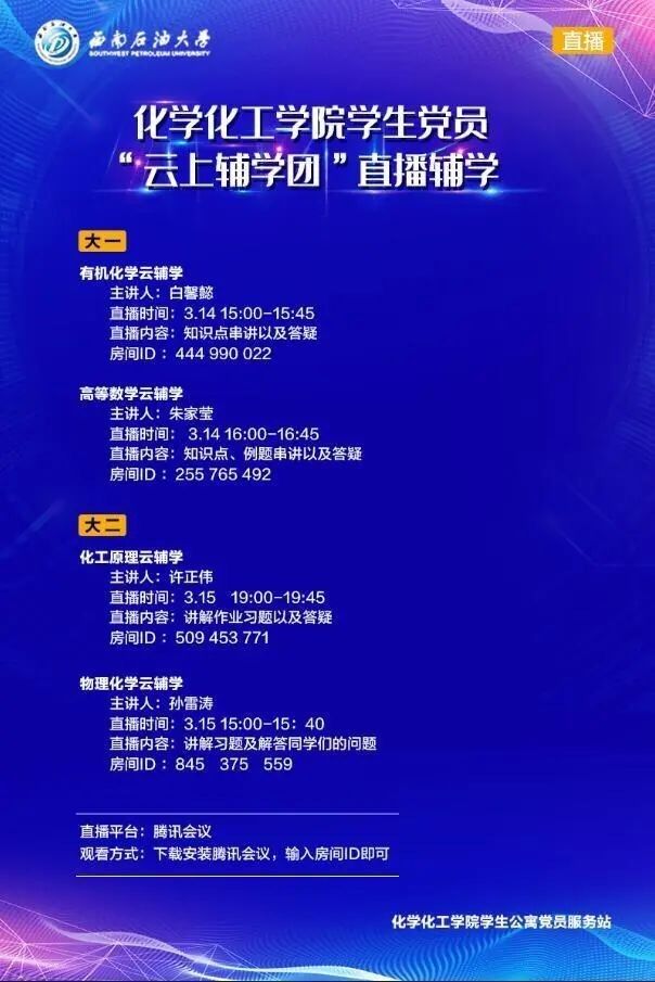 近期,新型冠狀病毒感染的肺炎疫情得到了有效控制,但疫情防控形勢仍然嚴峻,不能松懈。因此,為繼續做好疫情防控工作,貫徹落實好中央和省、市委關于疫情防控工作的總體部署,充分發揮教育系統各級黨組織戰斗堡壘作用和學生黨員先鋒模范作用,化工院黨站于3月14、15日組織開展了第二次“線上云輔導”直播教學活動。 本次“云輔導”活動主要針對大一的有機化學、高等數學科目的知識點串講以及答疑,對大二化工原理、物理化學科目的習題講解與答疑。 直播中,主講大一科目的同學首先對整章的知識點進行了系統性的串講,之后再進行了答疑;主講大二科目的同學詳細講解了作業中涉及重難點的題目以及其中知識點的聯系,并針對同學們提出的問題進行解答。 活動結束后,參與此次云輔導的欽英同學表示:“此次的輔導活動解決了很多作業里的問題,通過講解解題過程,我們對知識點有了更好的理解與記憶,特別是掌握了以前不懂的知識點,受益頗多。” 根據學校“開學不返校、停課不停學”的有關安排和要求,化工院優秀黨員同學自發成立“云上輔學團”幫助同學們更好的完成學習任務。疫情期間,我們雖然不能在學校讀書,但可以充分利用網絡等工具積極參與線上學習活動,努力提升自己。特殊時期,正常學習,掌握好專業科目,強化好專業知識,全面發展自我。(文、圖/李貌)