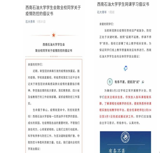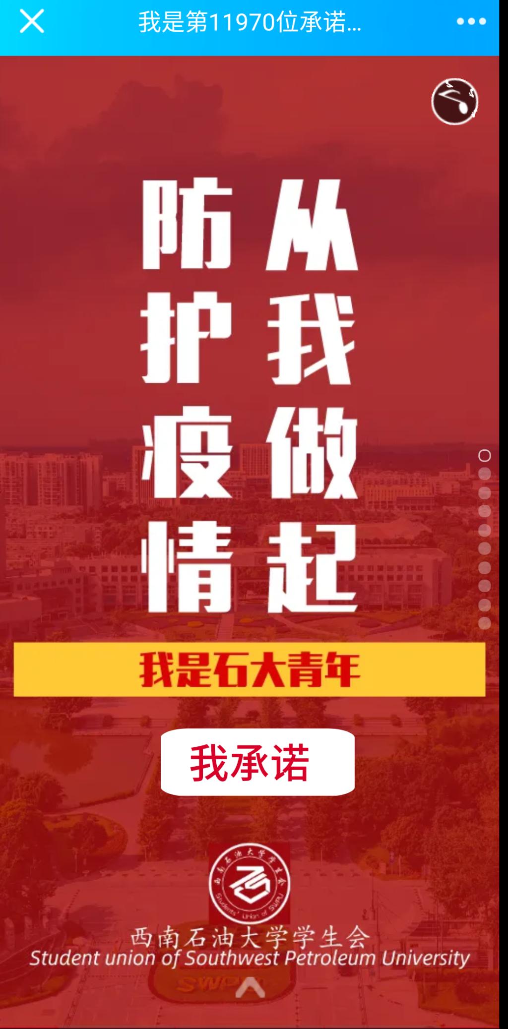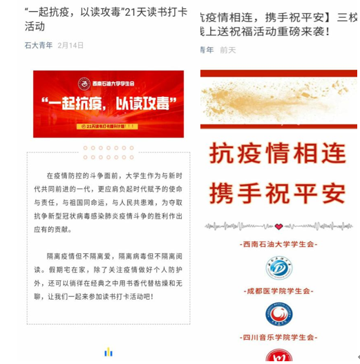 利用志愿工作倒班時間,卿成林通過“石大青年”官方微信面向全校青年學生發起防控倡議書和承諾書,抗疫防疫手冊等,發掘石大逆行者的先進事跡,動員廣大同學在做好自身防護的同時,爭當疫情群防群控的“戰斗員”“宣傳員”“保障員”;同時策劃并聯系了四川音樂學院、成都醫學院,聯合開展“抗疫情相連,攜手祝平安”三校學生抗疫活動,號召青年學子同舟共濟、共克時艱。
