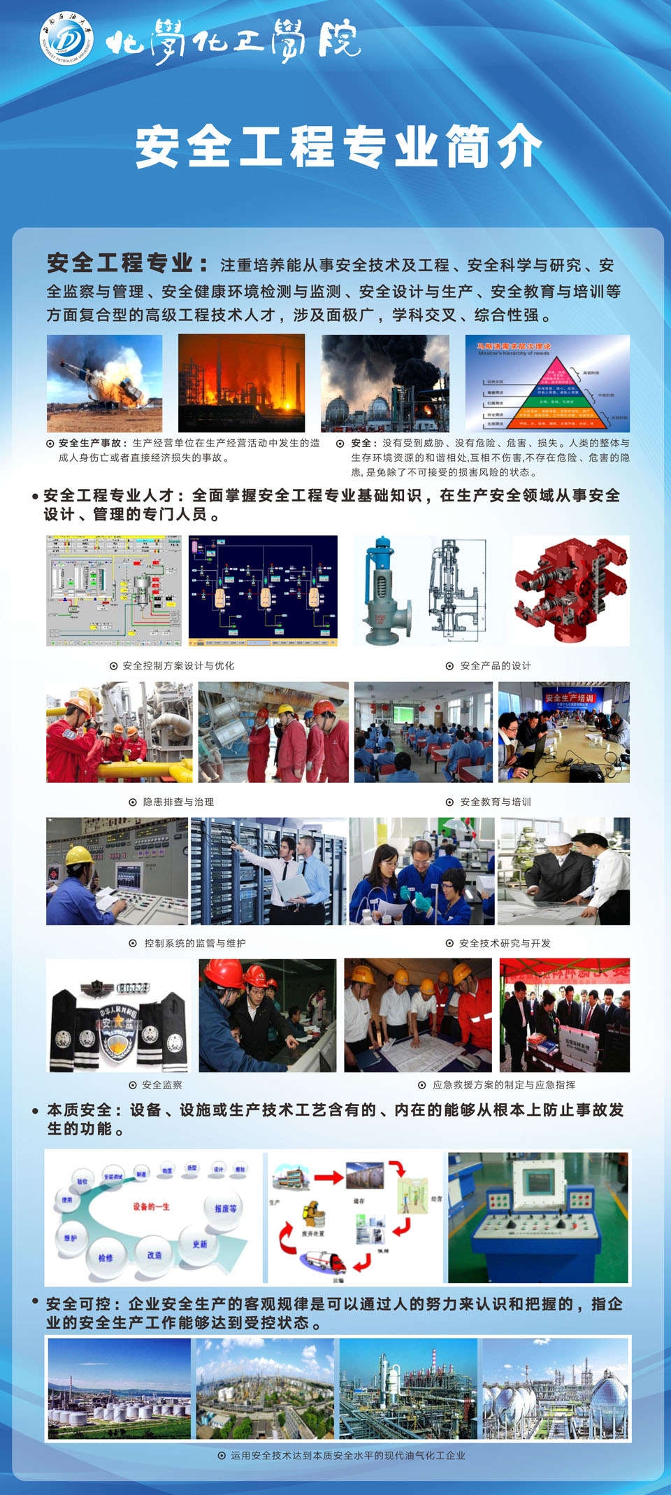 安全工程專業創辦于2008年,同年招收油氣安全工程的博士研究生和碩士研究生,2010年,在化學工程與技術一級學科下自設化工安全工程博士點。2011年,中國石油天然氣集團公司批準,依托環境工程和安全工程專業在我校建設HSE重點實驗室研究分室。該專業以油氣開采、儲運和化工等過程安全為特色,培養安全科學與技術的高級專門人才。 培養目標:本專業培養油氣及化工領域的應用型人才,具備油氣開采、集輸和化工等背景知識,系統掌握安全工程領域內的專業知識和基本技能,能在油氣、化工和采礦領域內進行安全技術開發與管理、安全監測與研究、安全設計與控制、安全教育與評價,能在政府部門從事安全監管與執法等工作。 主要課程:概率統計、物理化學、安全工程學、燃燒與爆炸學、化工原理、安全原理及安全管理學、油氣化工安全工程、機械及特種設備安全技術。 繼續深造方向:本專業學生在完成本科教育后,可繼續攻讀安全科學與工程、化學工程與技術和環境科學與工程等專業的碩士及博士學位。 就業去向:畢業生主要在國際知名的跨國石油公司、以“三大石油”公司為代表的國內石化企業和非煤礦山開采領域從事安全技術開發與管理、安全監測與研究、安全設計與控制、安全教育與評價工作,部分學生在安全生產監督管理局等政府部門從事安全監管與執法工作。 培養對象:全日制大學本科,學制四年,授予工學學士學位,要求考生身體健康,無色弱、無色盲。