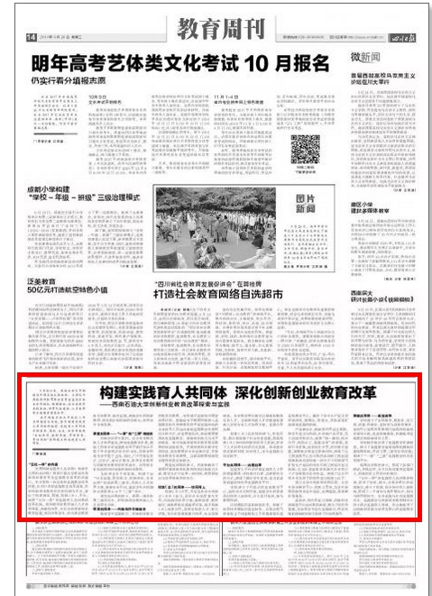 9月28日,《四川日報》在教育周刊版以《構(gòu)建實踐育人共同體 深化創(chuàng)新創(chuàng)業(yè)教育改革——西南石油大學(xué)創(chuàng)新創(chuàng)業(yè)教育改革探索與實踐》為題,報道了我校創(chuàng)新創(chuàng)業(yè)教育改革。