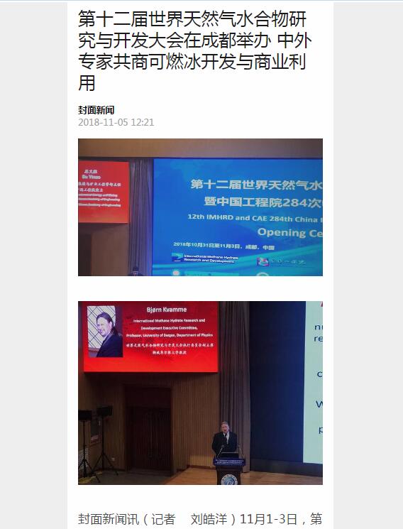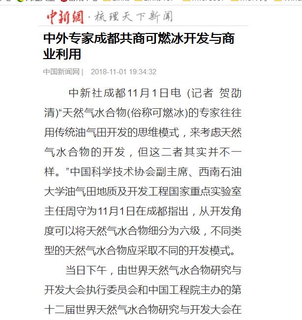 報道指出,11月1日-3日,第十二屆世界天然氣水合物研究與開發大會在西南石油大學召開。眾多天然氣水合物研究領域世界頂級專家首次齊聚一堂,就天然氣水合物的開發與商業利用進行交流探討。來自中國、美國、加拿大、俄羅斯、英國、澳大利亞、挪威、韓國、日本等國家的高等院校、科研機構及能源企業500余名代表參加本次盛會。與會代表包括22名中國工程院院士,69名海外專家和19名海外高校校長。