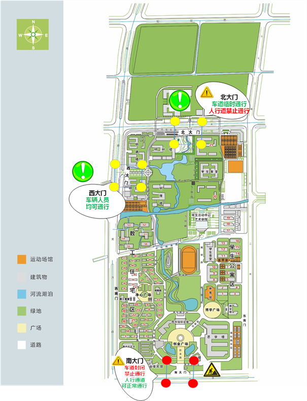 為保障師生及校外辦事人員機動車輛有序進出校門,學校決定臨時性開放校北大門,僅供機動車輛通行(北大門人行通道不開放)。施工期間,可供機動車輛正常進出的校門為:校西大門、北大門。