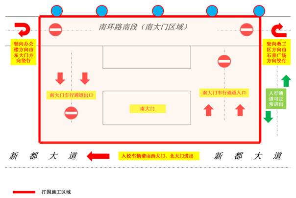 按照新都區“大運會”項目整體規劃,我校南大門景觀改造工程定于2021年4月7日14:30開始進場施工,預計5月底竣工。施工期間,施工方將對南大門機動車進出通道內外區域封閉打圍,禁止一切機動車輛進出(南大門人行通道不受施工影響)。