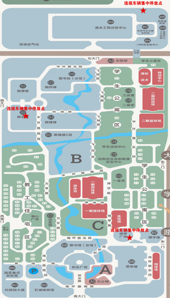 一、2024年5月6日起:學校各大門和校內將實行嚴格管控,違規車輛將禁止入校,校內行駛或停放的違規車輛,將統一放至違規車輛集中停放點(根據違規車輛停放地“就近”集中停放,具體見附圖)。車主將在登記信息、簽定承諾書后領取車輛,然后立即駛出校園。已上校內通行標示牌的車輛、非機動車按照《西南石油大學校園交通管理辦法(2024年修訂)》進行依法依規管理,將對超速、違規搭乘、亂停亂放等違規行為進行集中整治。