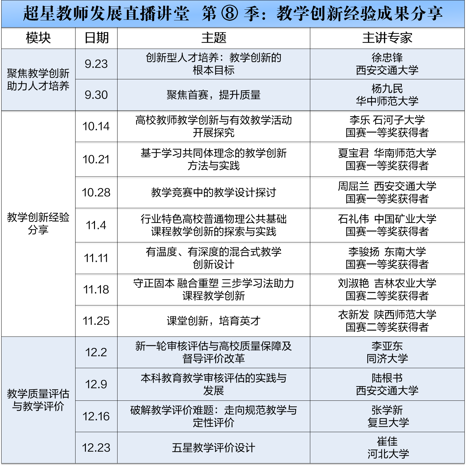 本季直播講堂圍繞“教學創新經驗成果分享”,在聚焦教學創新助力人才培養、教學創新經驗分享、教學質量評估與教學評價等方面,匯聚全國教學名師,邀請多位首屆全國高校教師教學創新大賽國賽獲獎選手,分享參賽成果、經驗與心得。具體安排見附表。