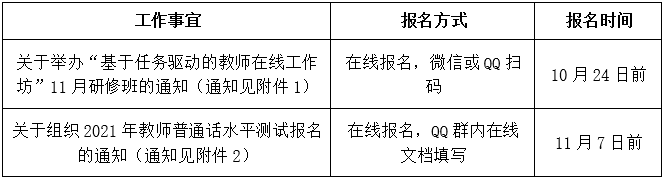 為保障教師在線工作坊研修、教師普通話水平測試工作的順利開展,現將10月教師教學發展相關工作做如下安排(具體通知見附件):