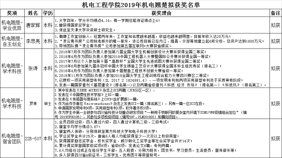 依據“機電翹楚”評選規定,經個人申請、年級推薦,學院評定小組審議等環節,現將我院2019“機電翹楚”擬獲獎名單公示如下(見圖片)。公示期間接受實名方式來電、來訪。過期不予受理。