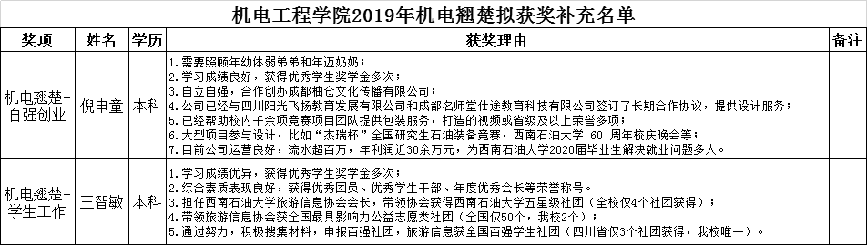依據(jù)“機(jī)電翹楚”評選規(guī)定,經(jīng)個人申請、年級推薦,學(xué)院評定小組審議等環(huán)節(jié),現(xiàn)將我院2019“機(jī)電翹楚”擬獲獎補(bǔ)充名單公示如下(見圖片)。公示期間接受實名方式來電、來訪。過期不予受理。
