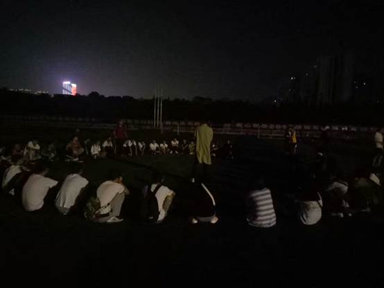 同學們越做越來勁,即使操場的燈關了,同學們的激情絲毫沒有消退。在昏暗的操場上,他們繼續歡笑著。