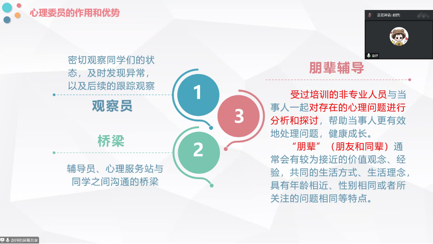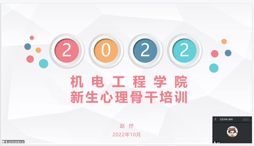 為充分發揮學院心理骨干、心理委員在大學生心理健康教育工作中的作用,增強責任意識,更好地開展心理自助與助人工作,12月1日16:00,機電院心理服務站舉辦了“全心護航,相伴成長”線上心理骨干培訓。此次培訓由機電院心理輔導員趙抒老師主講。2022級全體心理委員以及心理骨干參與培訓。