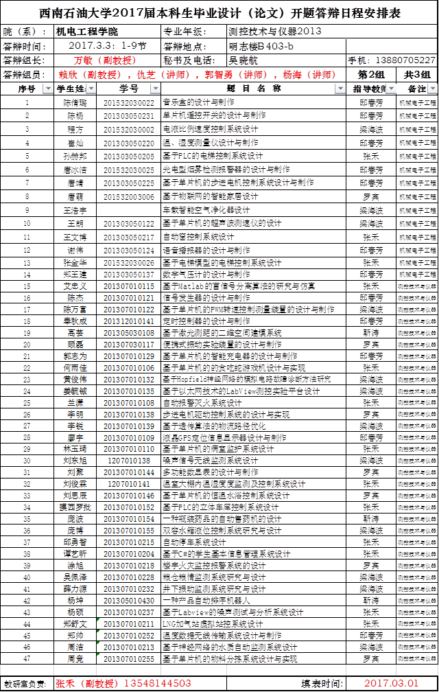 8、答辯秘書請注意登記好學生的信息,包括畢業設計題目、指導老師、學生的聯系方式,并注意收集齊全學生的考核意見書,答辯完畢后務必請參與答辯的老師們在考核意見書上簽字。