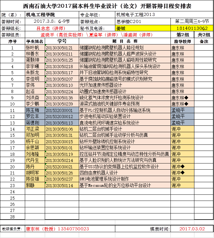 8、答辯秘書請注意登記好學生的信息,包括畢業設計題目、指導老師、學生的聯系方式,并注意收集齊全學生的考核意見書,答辯完畢后務必請參與答辯的老師們在考核意見書上簽字。