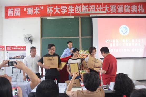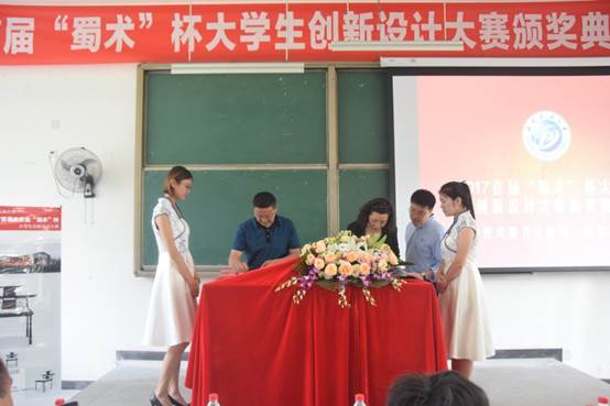 為表彰大學生創新設計成果和鼓勵大學生積極參加創新設計大賽,5月26日上午,2017首屆“蜀術”杯大學生創新設計大賽頒獎典禮暨校企合作簽字儀式在西南石油大學明志樓A301隆重舉行。西南石油大學校副校長王玲、成都市文廣新局版權處張艷處長、成都市創意產業聯合會張桂銘會長、熊偉秘書長、蜀菁文化創始人鐘明先生、成都東陽木雕廠溫春慶總經理、西南石油大學機電工程學院黨委書記李澗松、院長黃志強、黨委副書記姚偉寧、副院長侯勇俊、成都市版權協會、成都市版權事務中心、看度媒體等單位代表以及工業設計專業教師和獲獎學生等近一百多人參加頒獎儀式。儀式由機電工程學院副院長韓傳軍主持。