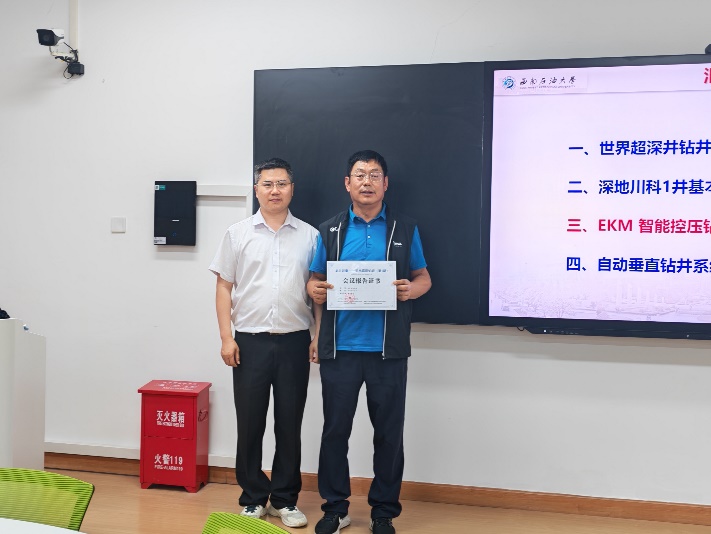 任濤教授以“從玩到學術研究-我的大學生活”為題,結合自身本碩博求學經歷,分享了如何將興趣轉化為科研動力,并圍繞管道機器人研發、學術成果轉化等展開論述。作為西南石油大學首屆“飛翔獎學術科技獎”獲得者,他深耕油氣智能裝備領域,研發的管道機器人已廣泛應用于多領域。聶榮國副教授則以“深地鉆井技術”為核心,系統解析了復雜地層鉆井技術難題及解決方案,其團隊在柔性鉆具組合強度分析等方面取得突破性成果,為深地工程安全高效作業提供了理論支撐。活動結束后,蔡燦代表學院為任濤教授和聶榮國副教授頒發了會議報告證書。