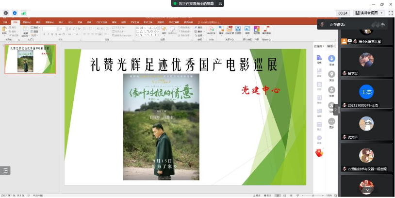 2022年10月4日19:00,學生黨建中心組織開展了禮贊光輝足跡優秀國產電影巡展活動,本次活動影片為《綠葉對根的情意》,由黨建中心學研部主持,本科生和碩士研究生共計114名同學參加本次活動。