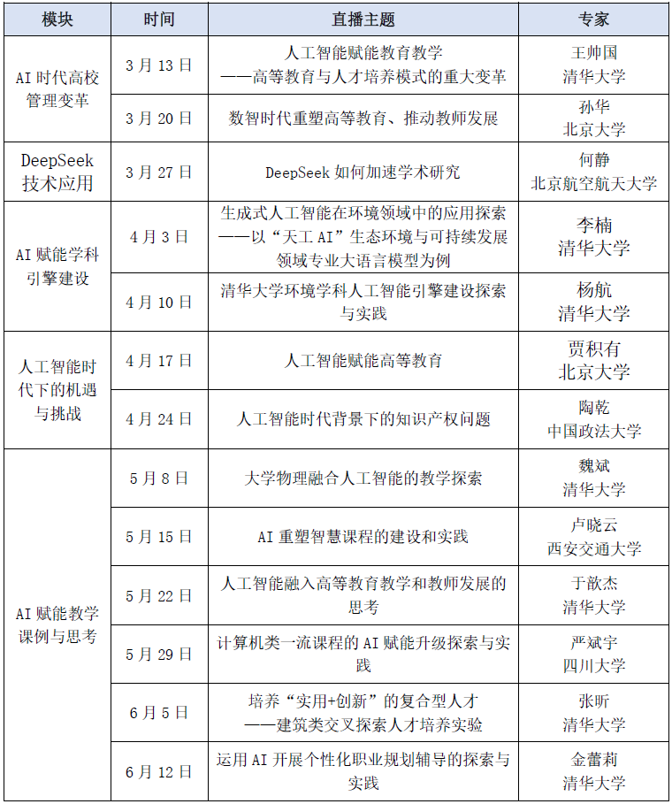本期研修課程內(nèi)容涵蓋人工智能背景下的教學(xué)管理、學(xué)科引擎建設(shè)、DeepSeek融入科研、AI融入教育教學(xué)理念與方法、課例展示等內(nèi)容,邀請清華大學(xué)、北京大學(xué)、北京航空航天大學(xué)、中國政法大學(xué)、四川大學(xué)等高校的專家學(xué)者、一線名師,從教育理念、技術(shù)應(yīng)用、課堂融入等不同維度,分享人工智能賦能高等教育的思考與實踐。具體安排見表1。