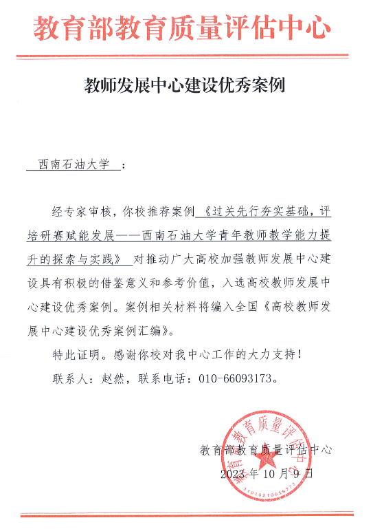 近日,教育部教育質(zhì)量評估中心公布全國高校教師發(fā)展中心建設(shè)優(yōu)秀案例,我校教師教學(xué)發(fā)展中心報送的《過關(guān)先行夯實基礎(chǔ),評培研賽賦能發(fā)展——西南石油大學(xué)青年教師教學(xué)能力提升的探索與實踐》入選,案例材料編入《高校教師發(fā)展中心建設(shè)優(yōu)秀案例匯編》。四川省本次入選高校共5所,我校是全省唯一入選的省屬高校。