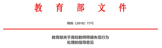 三、對(duì)高校教師師德失范行為實(shí)行“一票否決”。高校教師出現(xiàn)違反師德行為的,根據(jù)情節(jié)輕重,給予相應(yīng)處理或處分。情節(jié)較輕的,給予批評(píng)教育、誡勉談話、責(zé)令檢查、通報(bào)批評(píng),以及取消其在評(píng)獎(jiǎng)評(píng)優(yōu)、職務(wù)晉升、職稱評(píng)定、崗位聘用、工資晉級(jí)、干部選任、申報(bào)人才計(jì)劃、申報(bào)科研項(xiàng)目等方面的資格。擔(dān)任研究生導(dǎo)師的,還應(yīng)采取限制招生名額、停止招生資格直至取消導(dǎo)師資格的處理。以上取消相關(guān)資格處理的執(zhí)行期限不得少于24個(gè)月。情節(jié)較重應(yīng)當(dāng)給予處分的,還應(yīng)根據(jù)《事業(yè)單位工作人員處分暫行規(guī)定》給予行政處分,包括警告、記過、降低崗位等級(jí)或撤職、開除,需要解除聘用合同的,按照《事業(yè)單位人事管理?xiàng)l例》相關(guān)規(guī)定進(jìn)行處理。情節(jié)嚴(yán)重、影響惡劣的,應(yīng)當(dāng)依據(jù)《教師資格條例》報(bào)請(qǐng)主管教育部門撤銷其教師資格。是中共黨員的,同時(shí)給予黨紀(jì)處分。涉嫌違法犯罪的,及時(shí)移送司法機(jī)關(guān)依法處理。