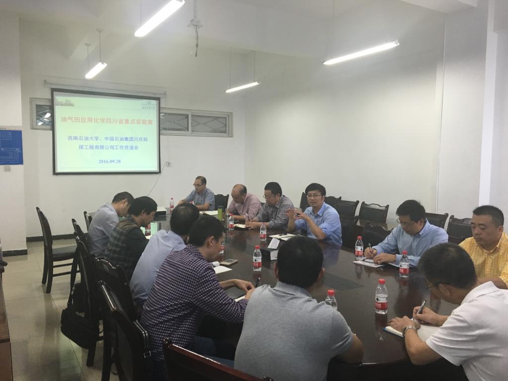 2016年9月28日,西南石油大學(xué)、中國石油集團川慶鉆探工程有限公司在西南石油大學(xué)化學(xué)化工學(xué)院會議室明德樓A523就油氣田應(yīng)用化學(xué)四川省重點實驗室的相關(guān)工作進行了一次交流,雙方就重點實驗室現(xiàn)取得的成果和存在的問題進行溝通與交流,并對下一步工作重點進行了討論。