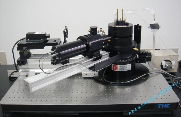該設(shè)備為美國布魯克海文儀器公司制造的BI-200SM型的廣角光散射系統(tǒng)。采用BI-9001數(shù)字相關(guān)器,通過動態(tài)光散射的方法可以測量小至1nm的納米顆粒分布情況。通過靜態(tài)光散射的方法可測量高分子材料的Zimm、Berry、Debye曲線、分子量、回旋半徑及第二維里系數(shù)。
