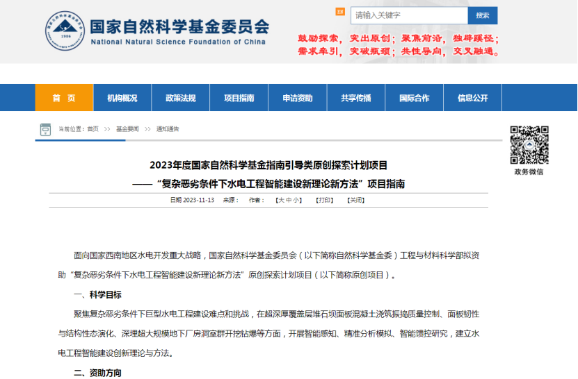 面向國家西南地區(qū)水電開發(fā)重大戰(zhàn)略,國家自然科學基金委員會(以下簡稱自然科學基金委)工程與材料科學部擬資助“復(fù)雜惡劣條件下水電工程智能建設(shè)新理論新方法”原創(chuàng)探索計劃項目(以下簡稱原創(chuàng)項目)。