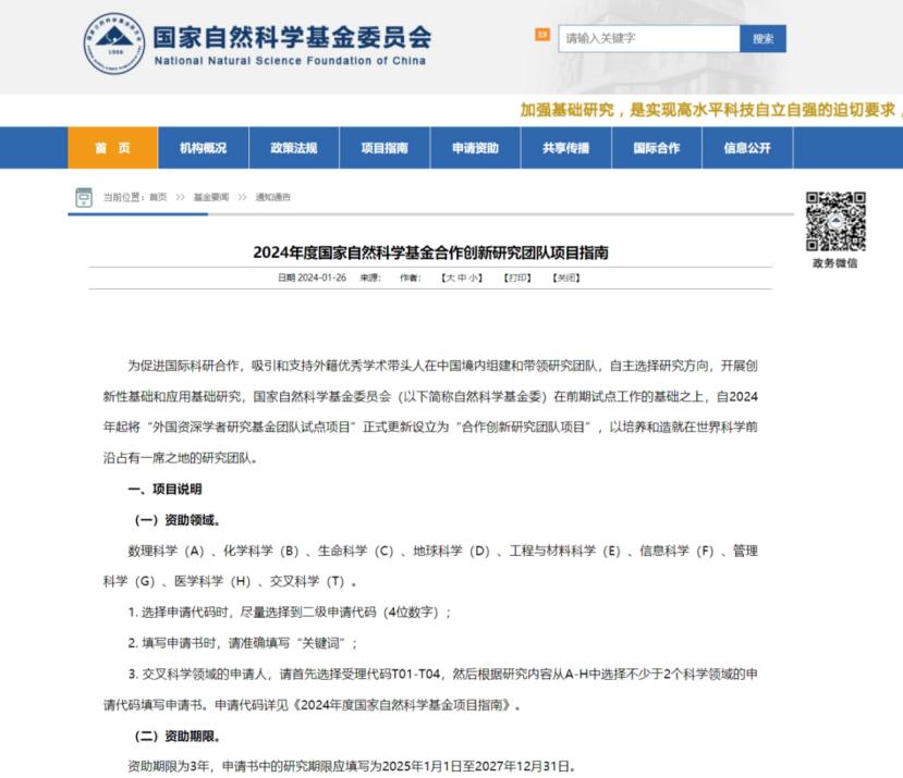 2024年度國家自然科學基金合作創新研究團隊項目指南