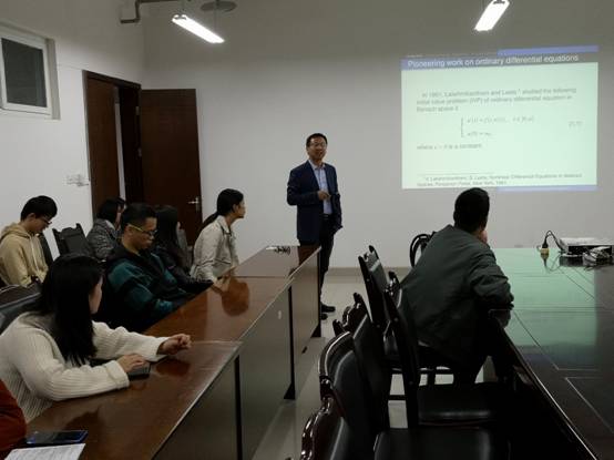 2019年10月25日下午,西北師范大學陳鵬玉副教授受邀到我院作學術報告“On fractional non-autonomous evolution equation with nonlocal initial conditions”。在報告中,陳老師從泛函分析中重要的壓縮映射原理出發介紹了重要的Schauder不動點定理和Sadovskii不動點定理,然后介紹了相關定理的在解決非線性問題中的重要應用和逐步取得的最優條件。