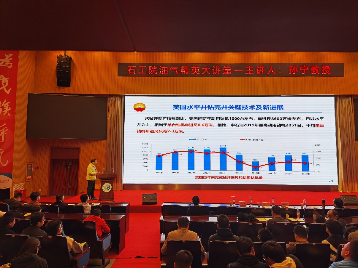11月20日上午,由石油與天然氣工程學(xué)院主辦的“油氣精英”大講堂在圖書館學(xué)術(shù)報告廳舉行,中石油集團公司高級專家、孫越崎基金會副秘書長孫寧教授應(yīng)邀作了題為《中石油頁巖油氣“十四五”發(fā)展規(guī)劃及鉆完井工程配套規(guī)劃》的報告,報告會由西南石油大學(xué)副校長郭建春主持,學(xué)校500余名師生參加本次報告會。