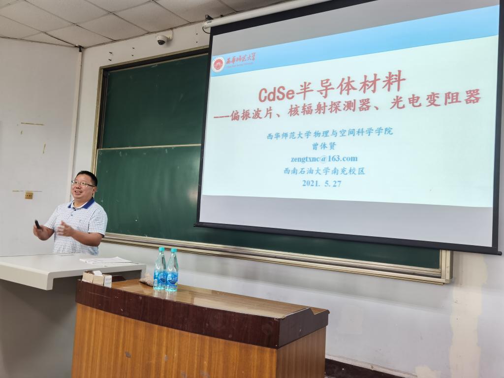 曾體賢教授對光電學科科研平臺建設、科研團隊建設給予了指導;結合CdSe半導體材料制備及其偏振波片、核輻射探測器、光電變阻器件等具體科研項目介紹了科學研究的過程和研究方法;通過案例形式特別介紹了如何以市場需求為向導,服務南充社會經濟,解決企業(yè)難點和痛點為出發(fā)點開展科研,實現科研成果轉換和產學研合作共贏的途徑和方法。