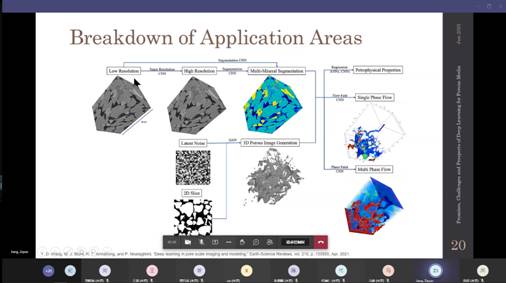 蔣教授首先介紹了人工智能的發展歷史,然后詳細講解了機器學習與深度學習的相關知識,尤其是對大家非常感興趣的機器學習模型的三大類別、機器學習與傳統的編程的區別、需要深度學習的原因和訓練神經網絡等方面進行了深入淺出地講解。然后,蔣教授又詳細介紹了數字巖石物理(DRP)的工作流程,他指出可以在特征圖片中應用數學統計方法和計算機視覺的方法(比如深度學習),然后通過物理屬性進行描述和驗證。隨后,蔣教授又用幾個生動的實例說明了近幾年DRP的應用領域,例如對數字巖石的超分辨率重構、對數字巖石的特點區域的精準分割、巖石孔隙流動預測和單相流的2D數字巖石生成3D數字巖石等。