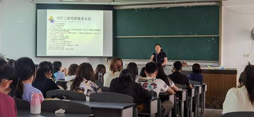 高萬紅教授主要從社會工作研究與行動研究兩個方面為同學們做了詳細講解。她表示:社會工作研究是社會工作者、社工教育者或者社會福利機構的員工使用社會科學研究方法,收集和分析資料,協助社會工作目標而開展的活動。因此,同學們在進行社工研究時,應當注意議題的選擇、理論框架的視角以及研究的方法等。每一個社工學子都應在社會研究中學會如何正確協調專業社會工作者與社區工作者之間的關系。高萬紅教授還從行動的研究的基本特征、原則與社會工作的關系等方面做了講解,幫助同學們進一步理解掌握。