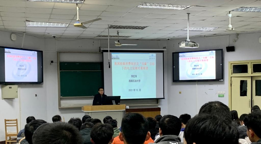 為提升學生環保意識,了解我國能源消費狀況及“雙碳”目標下電力發展對策展望,12月1日19:00,李紅偉教授在第四教學樓4517教室為信息學院學生作題為雙碳下的可再生能源與分布式發電的學術報告,信息學院電氣工程與智能控制2021級全體學生參與此次講座。