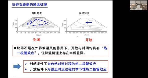 講座中,張明義研究員首先分析了多年凍土區(qū)路基工程病害類型、特征及成因,由于氣候變暖,凍土退化嚴(yán)重,多年凍土退化會(huì)引發(fā)路基工程病害,凍土工程高病害率成為了世界性難題。隨后,介紹了凍土路基熱力穩(wěn)定性計(jì)算理論與模型,考慮凍融變形和體積未凍水滯后效應(yīng),確定了土體導(dǎo)熱系數(shù)、體積熱容兩個(gè)關(guān)鍵參數(shù),介紹了水分遷移方程、能量方程、力學(xué)方程及相互耦合關(guān)系。之后,展示了凍土路基工程病害最新防治技術(shù),闡述了對(duì)于不同含冰量的凍土采用的不同設(shè)計(jì)原則。最后,從理論與數(shù)值模擬、研究領(lǐng)域、研究區(qū)域等方面對(duì)凍土工程研究的未來發(fā)展趨勢(shì)進(jìn)行了展望。