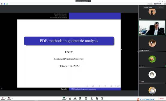 10月14日,中國(guó)科學(xué)技術(shù)大學(xué)李嘉禹教授應(yīng)邀來我院作了題為:“Some methods in geometric analysis”的學(xué)術(shù)報(bào)告。本次報(bào)告由科學(xué)技術(shù)發(fā)展研究院、理學(xué)院、人工智能研究院、非線性動(dòng)力系統(tǒng)研究所、數(shù)理力學(xué)研究中心聯(lián)合主辦。報(bào)告會(huì)由理學(xué)院主持工作副院長(zhǎng)宋國(guó)杰教授主持,學(xué)院部分教師、研究生、本科生聆聽了講座。