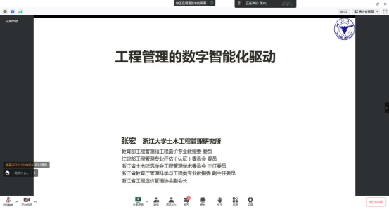 10月19日下午,浙江大學建筑工程學院教授、博士生導師張宏教授應邀為我院師生作了題為“工程管理的數字智能化驅動”的線上學術講座。張宏教授曾主持或參與香港RGC、國家自然科學基金面上、教育部博士點專項博導類基金、中國工程院重大咨詢項目和中國科學院學部咨詢項目等科研項目。在國際性權威期刊上以第一或通訊作者發表100多篇SCI論文,他引2500次以上。張宏教授兼任教育部工程管理和工程造價專業指導委員會委員、住建部高等教育工程管理專業評估委員會委員、浙江省教育廳管理科學與工程類專業教指委副主任委員、浙江省土木建筑學會工程管理學術委員會主任委員,浙江省建設工程造價管理協會副會長。本次講座由我院副院長梁琦博士主持,全校近百名師生參加了此次講座。