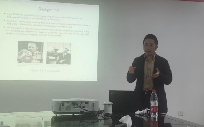 鐵磁流兼具液體的流動性和固體的磁性。可以利用鐵磁流體的順磁性,通過控制外部磁場來操縱其流動和界面行為。鐵磁流在很多工程和生物醫學領域,如3D打印,微型泵,流體密封,藥物輸送和眼科手術等應用比較廣泛。該問題可看作是流體和磁場的耦合。由于該問題的非線性特點,加上變量眾多,導致該問題的數值求解非常困難。謝小平教授針對Shliomis提出的磁流體模型,介紹了一類保能量的混合有限元方法。報告中首先介紹了該問題的研究現狀、模型的特點,一些有限元方法常用的理論;接著介紹了保能量的含義、該模型的半離散以及全離散混合有限元方法,說明了該問題連續解和離散解的存在性和唯一性,給出了最優誤差估計,并介紹了求解該非線性問題的解耦算法。