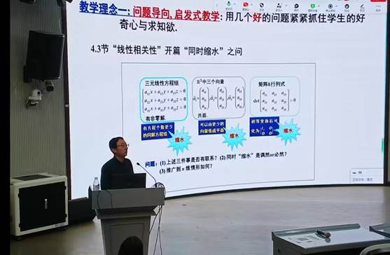 報告中,楊老師從我國高等教育課程建設的背景與現狀出發,分享了清華大學在《線性代數》課程中進行的多個方面的探索與創新實踐,包括教學理念、教學方法、思政融入等。根據課程特點提出了問題導向、抽象與形象結合、理論本質等教學理念,并通過大量詳實的教學案例將各項理念貫穿到教學活動中。在教學設計中聯系實際與熱點問題,引入課程思政,講述中國故事,立德樹人。在講解數學內容的同時突出數學思想與價值觀,引導學生從挖掘數學本質,體會數學之精煉所產生的美感與價值。清華大學在教學中特別注重因材施教,根據學生的特點開發了十多種不同類型的《線性代數》課程,體現了“以學生為中心”的教育初心,獲得了學生的廣泛認同。會后,楊老師和在場師生進行了深入交流與討論。