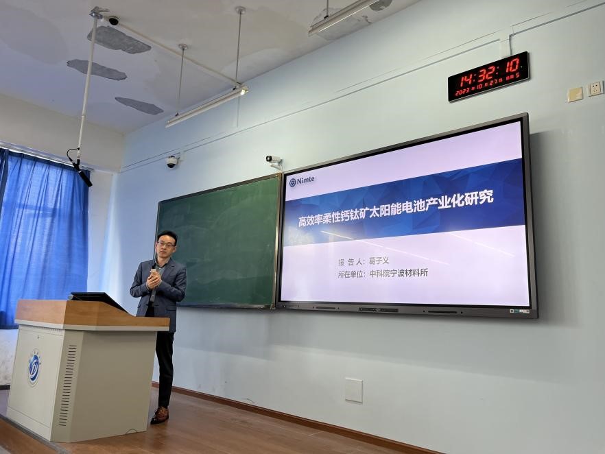 10月27日下午,中國科學院寧波材料所二級研究員、博導,國家杰出青年基金獲得者、英國皇家化學會會士,浙江省能源光電子工程研究中心主任葛子義研究員在明德樓A205作了“高效率柔性鈣鈦礦太陽能電池產業化研究”的學術報告。新能源與材料學院新能源相關專業師生參加了此次報告。
