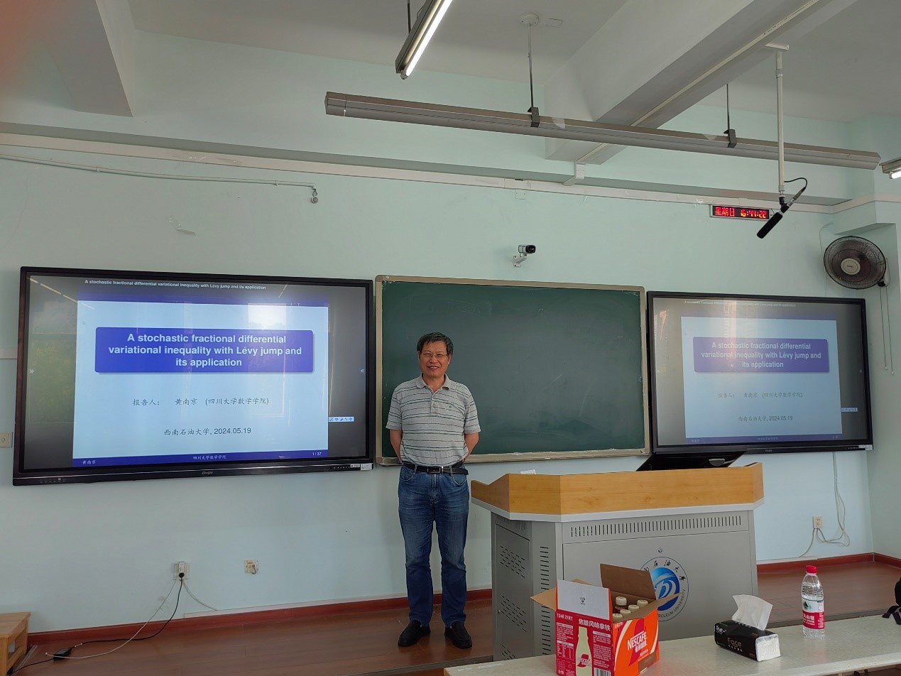 2024年5月20日,四川大學數學學院教授黃南京應邀至我院進行題為“A stochastic fractional differential variational inequality with Levy jump and its application”的學術報告。此次報告由理學院、人工智能研究院、非線性動力系統研究所、數理力學研究中心以及科學技術發展研究院聯合主辦,由理學院副院長閔超教授主持,學院部分教師、學生聆聽了講座。