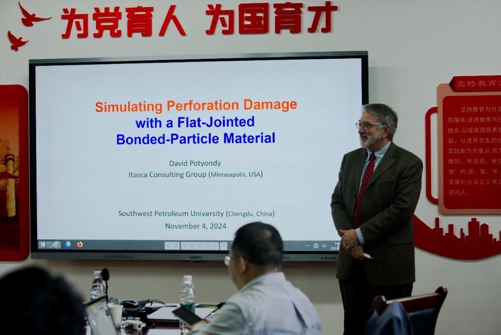 會上,David以“Simulating Perforation Damage with a Flat-Jointed Bonded-Particle Material”為題,向大家探討了粘接顆粒模型在模擬井筒射孔附近砂巖破碎過程中的潛在應用。報告結束后,李一波教授對此次報告做出了總結,對David Potyondy表示感謝,指出整場報告深入淺出,內容豐富,具有很強的指導意義。報告現場氣熱烈,David教授與學生相互溝通交流,增加了學生對粘接顆粒模型的理解與應用。