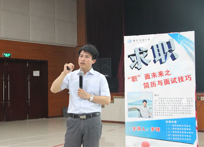 羅鋒老師分別從簡歷的形式與特點、網申簡歷注意事項、簡歷制作差異化技巧、面試的形式與特點、面試的方法與技巧等五個方面分別進行了生動細致的講解。“你們最理想的職業是什么?”,羅鋒老師不時地向大家拋出問題。在案例分析中,他通過一個個小故事,給在場師生留下了深刻印象,也對學生進行自我認知、簡歷制作、面試、職業認識等提供了指導,現場學生收獲頗豐。
