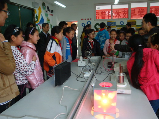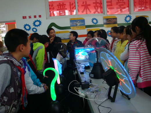 志愿者們把深奧的物理知識與日常生活結合起來,用童聲般的語言聲情并茂地為孩子們邊講解邊演示,整個活動現場光怪陸離、活躍非凡。志愿者為孩子們演示了魚洗盆的共振現象、陀螺的不倒現象、神奇的輝光放電現象以及光的折射、視覺暫留、運動中的平衡等現象。