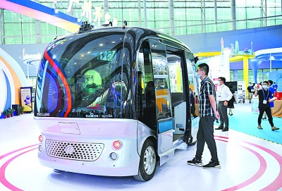 “十三五”時(shí)期,我國(guó)科技實(shí)力躍上新的大臺(tái)階。圖為第28屆廣州博覽會(huì)上展出的無(wú)人駕駛巴士。新華社發(fā)