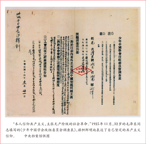 ——“毛澤東同志在青年時(shí)期就立下拯救民族于危難的遠(yuǎn)大志向……十月革命一聲炮響,給中國(guó)送來(lái)了馬克思列寧主義。從紛然雜陳的各種觀點(diǎn)和路徑中,經(jīng)過(guò)反復(fù)比較和鑒別,毛澤東同志毅然選擇了馬克思列寧主義,選擇了為實(shí)現(xiàn)共產(chǎn)主義而奮斗的崇高理想。在此后的革命生涯中,不管是‘倒海翻江卷巨瀾’,還是‘雄關(guān)漫道真如鐵’,毛澤東同志始終都矢志不移、執(zhí)著追求。”