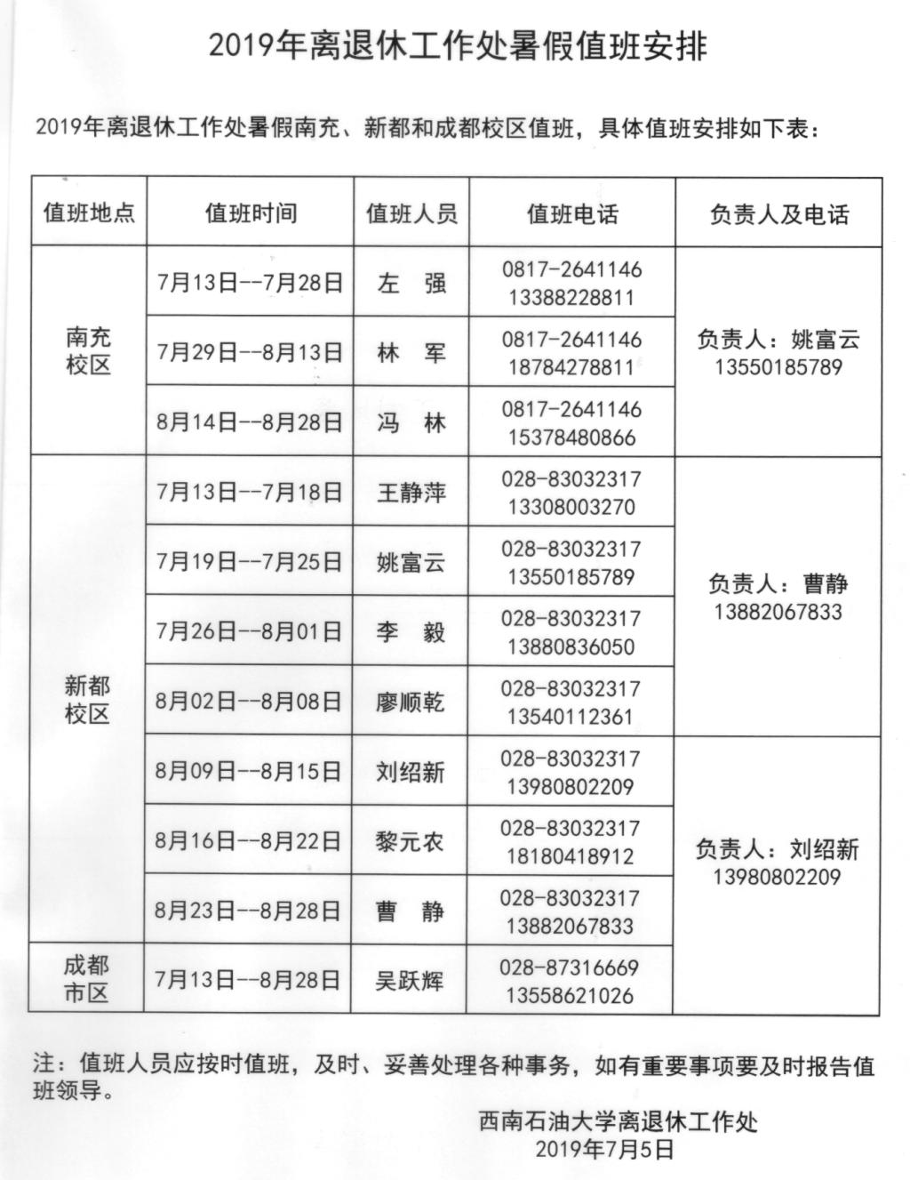 特別提醒:因暑假學(xué)校要對辦公電話進行改造,可能會影響到值班座機通訊,如離退休老同志有事,請撥打值班人員的手機號碼。